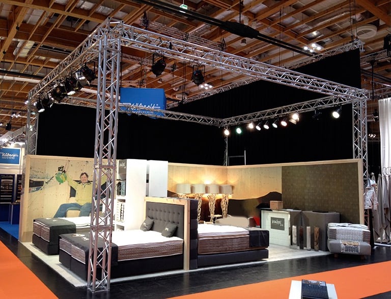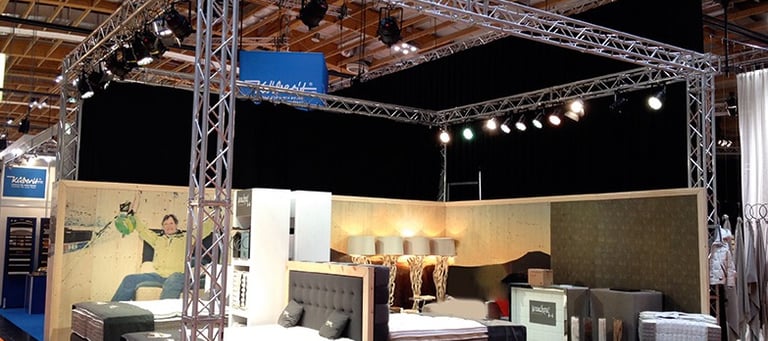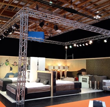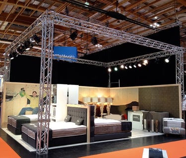 Technische Konstruktionen für Messeflächen und Präsentationsbereiche, die Ordnung, Präzision und Markenpräsenz sichtbar transportieren.