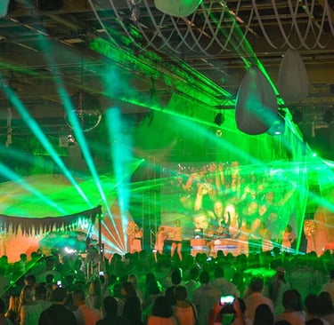 Großflächige Lichtgestaltung, klare Bildachsen und starke Raumwirkung schaffen Eventatmosphäre, die hochwertig wirkt und emotional präsent bleibt.